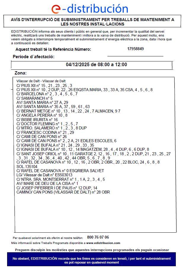 Aquest dijous 4 de desembre, EDISTRIBUCIÓN realitzarà treballs de manteniment i millora a la xarxa de distribució a diversos punts del municipi.