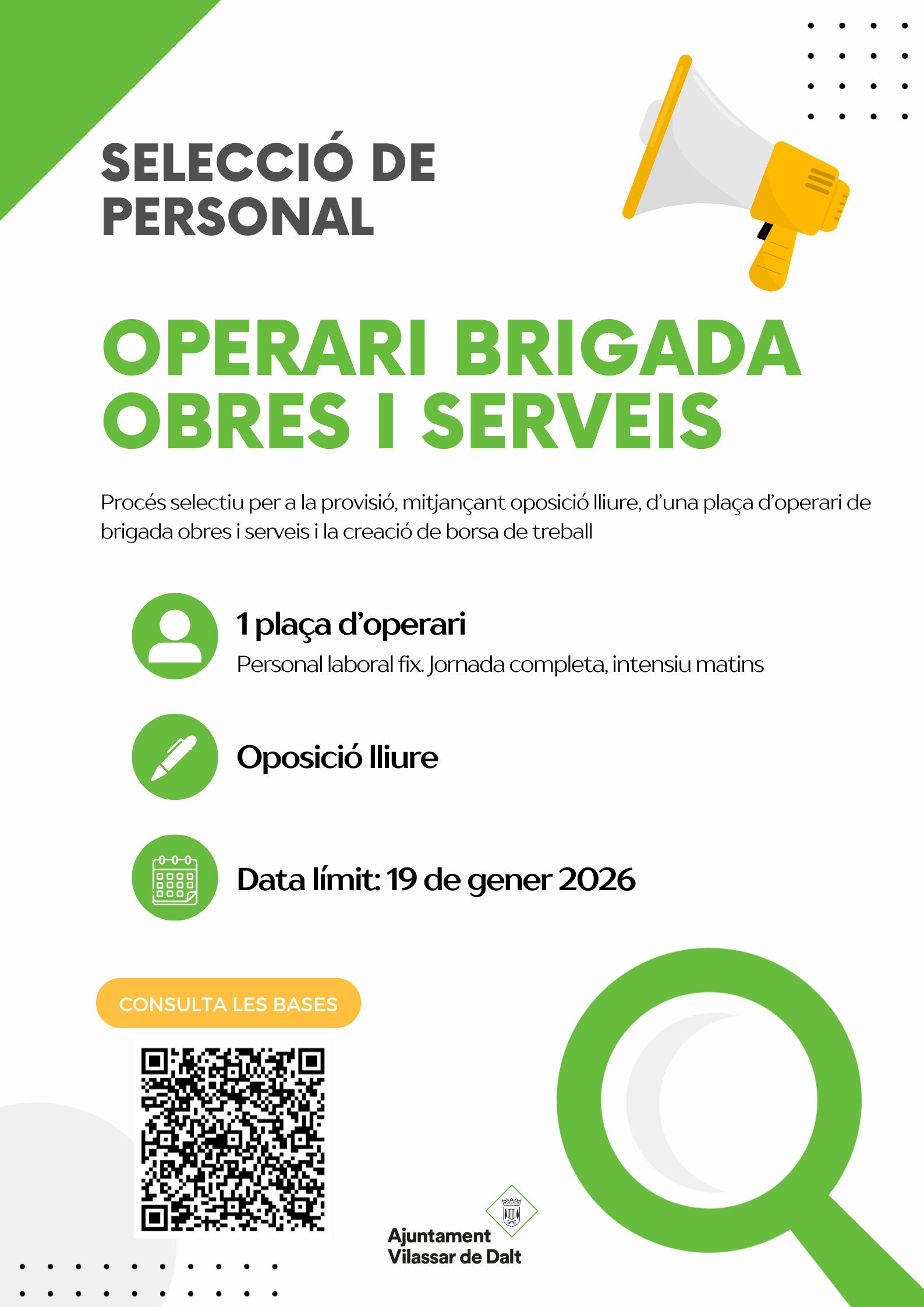 Ja s'han publicat les bases dels processos selectius per cobrir, mitjançant oposició lliure, una plaça d'oficial i una altra d'operari de brigada d'obres i serveis, vacants a la plantilla de personal laboral.