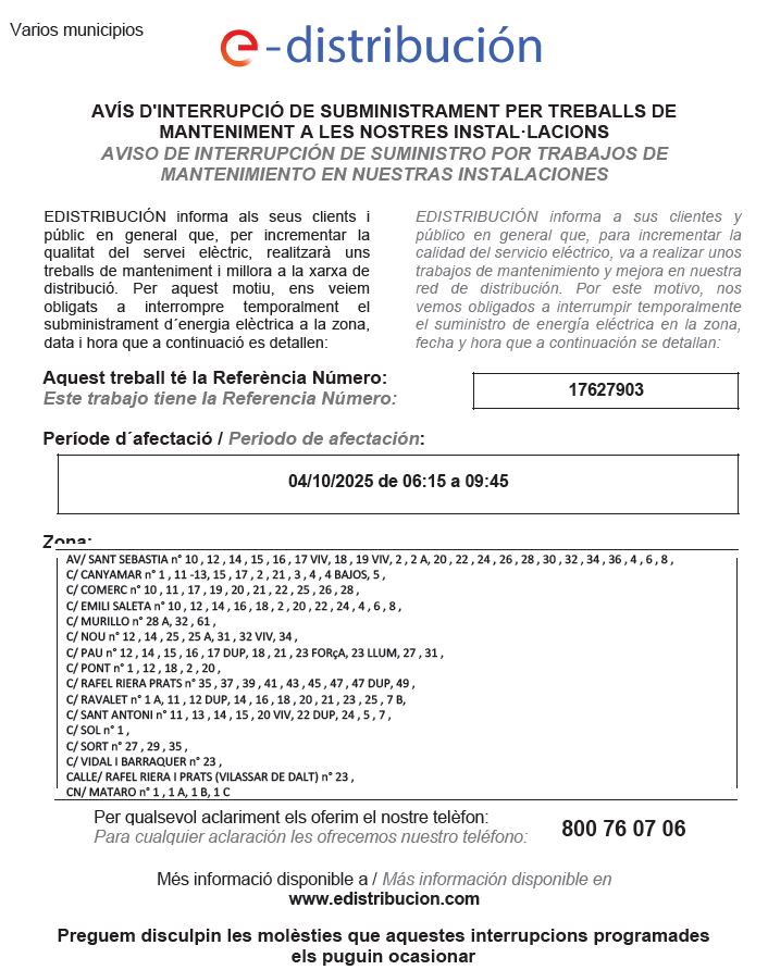 Aquest dissabte 4 d'octubre, EDISTRIBUCIÓN realitzarà treballs de manteniment i millora a la xarxa de distribució a diversos punts del municipi.