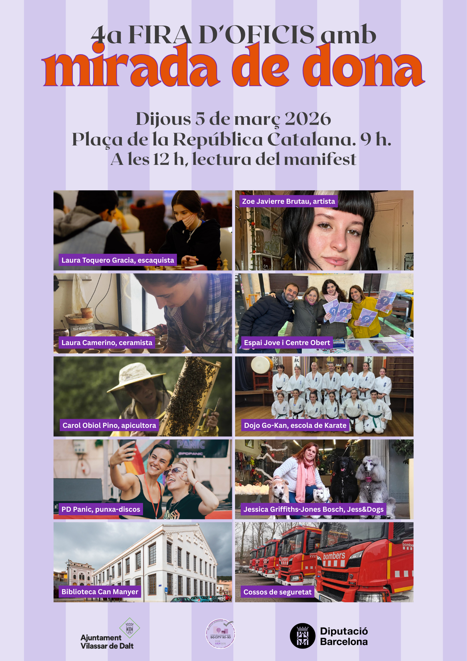 El plat fort, com és habitual, serà el dijous 5 de març amb la 4a edició de la Fira d'oficis amb mirada de dona que reunirà a la Plaça de la República Catalana una desena de dones que donaran a conèixer les seves professions. A les 12 del migdia serà el moment de l'acte institucional amb la lectura del manifest. El mateix 5 de març, el Museu municipal de Vilassar de Dalt acollirà una conversa amb la jugadora de bàsquet Laia Palau. També a partir del 5 de març i durant tot el cap de setmana, la façana de l'Ajuntament lluirà il·luminada de color lila.