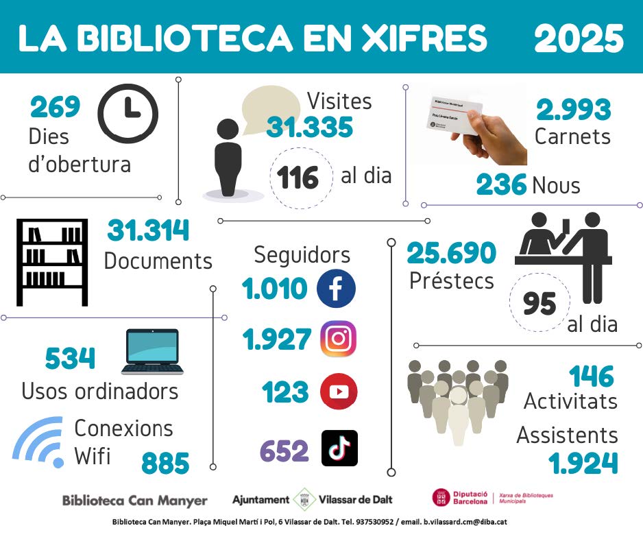 La Biblioteca Can Manyer ha publicat la memòria de l'equipament que recull les dades més significatives de l'any 2025. El document destaca que la bilbioteca ha rebut 31.335 visites, s'han fet 25.690 préstecs i fins a 236 carnets nous. Durant el 2025, la Biblioteca va organitzar un total de 146 activitats que van reunir gairebé 2.000 assistents. La memòria valora els resultats obtinguts i dona a conèixer també algun aspecte a millorar com és la manca de comfortabilitat a causa dels problemes del sistema de climatització que està previst resoldre aquest any.