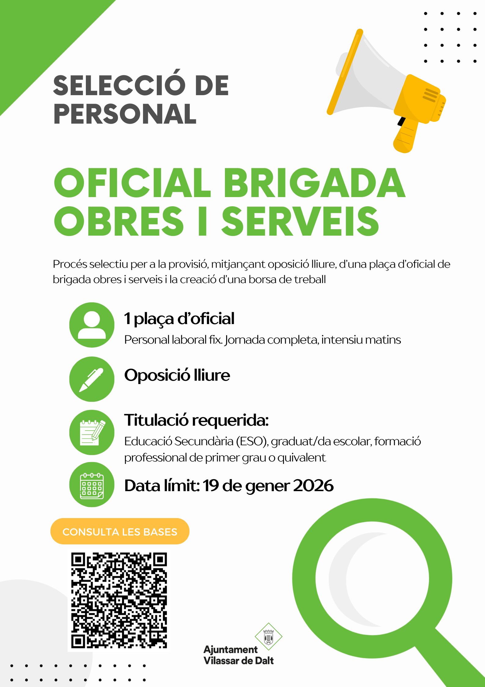 Ja s'han publicat les bases dels processos selectius per cobrir, mitjançant oposició lliure, una plaça d'oficial i una altra d'operari de brigada d'obres i serveis, vacants a la plantilla de personal laboral.